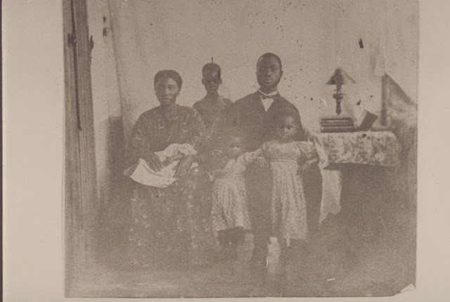 Women grinding corn in the compound of a traditional swish house in Osu, Accra, circa 1870-'80. Photo probably taken by Basel missionary in Accra.